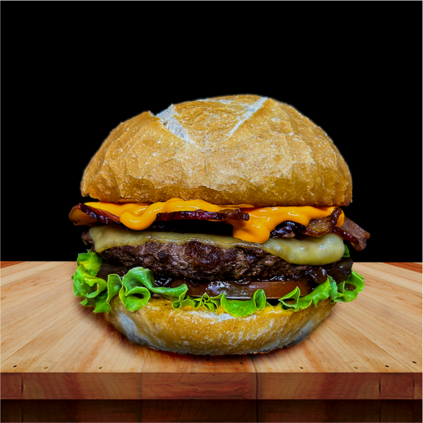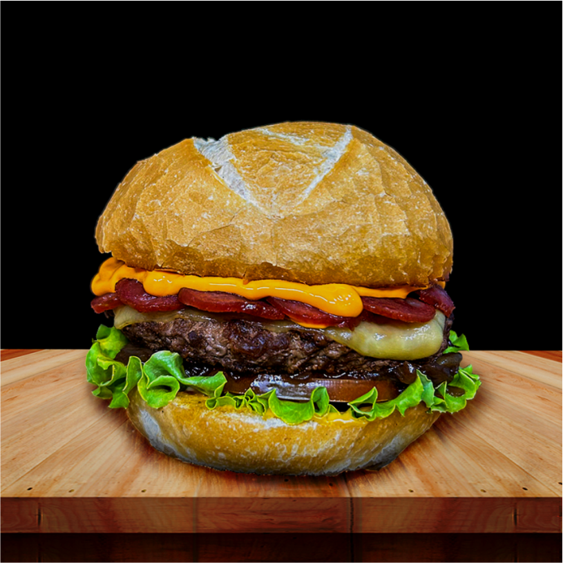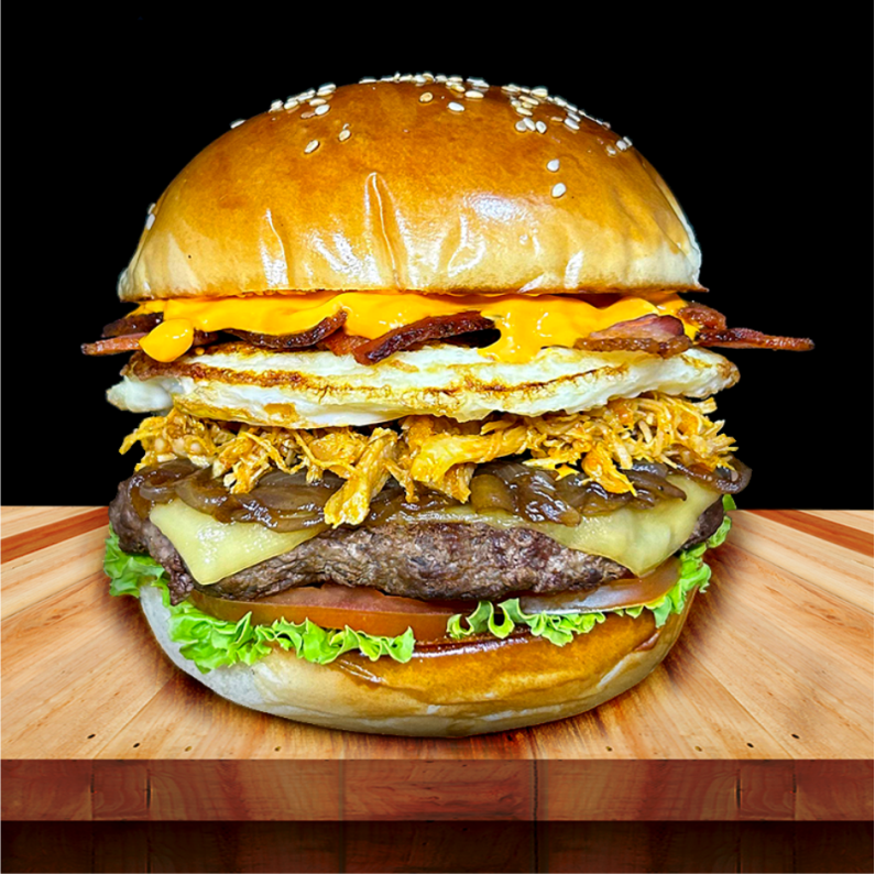 08 - X-Bruto LabaredaPão brioche ▪️ Hambúrguer bovino 150g ▪️ Queijo prato ▪️ Molho cheddar ▪️ Sobrecoxa de frango desfiada ▪️ Tiras de bacon ▪️ Ovo ▪️ Cebola caramelizada ▪️ Alface, tomate e molho Labareda.R$ 29,00