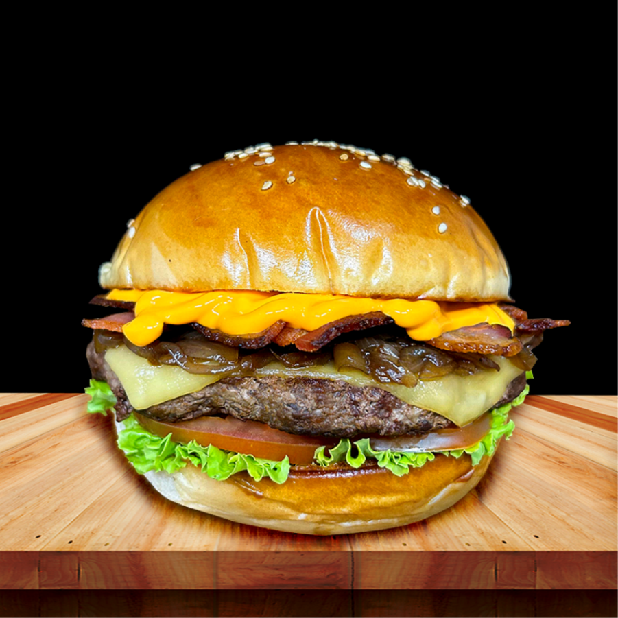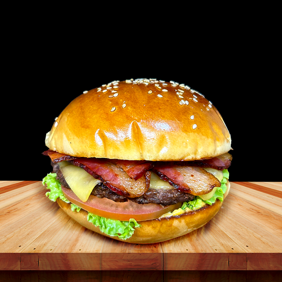 04 - X-BaconPão brioche ▪️ Hambúrguer bovino 100g ▪️ Tiras de bacon ▪️ Queijo prato ▪️ Alface, tomate e molho labareda.R$ 17,00