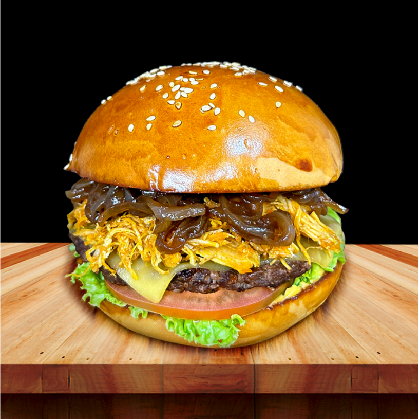 05 - Labareda FrangoPão brioche ▪️ Hambúrguer bovino 100g ▪️ Sobrecoxa de frango desfiada ▪️ Queijo prato ▪️ Cebola caramelizada ▪️ Alface, tomate e molho labareda.R$ 16,00