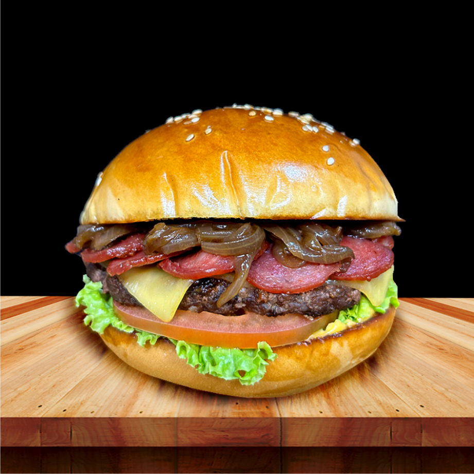 06 - Labareda CalabresaPão brioche ▪️ Hambúrguer bovino 100g ▪️ Calabresa fatiada ▪️ Queijo prato ▪️ Cebola caramelizada ▪️ Alface, tomate e molho labareda.R$ 16,00